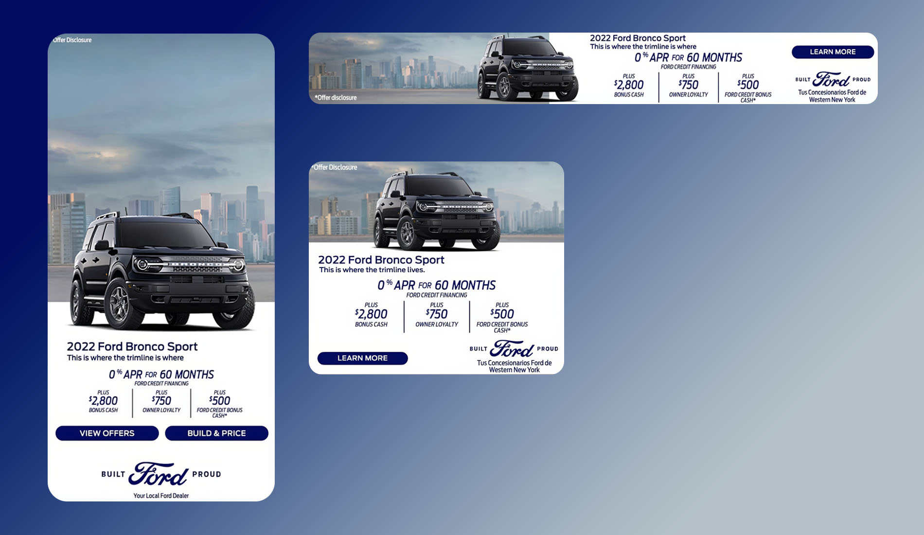 The dynamic ads are templated per ad type; Library, MYCO Message, MYCO Non-Message and Sales Event. Sales Event ads are seasonal. The templates are uploaded into Google’s DV360 system and make calls to up to three spreadsheets, 1) a spreadsheet for all creative (Copy, Imagery, CTA copy, Dealer Tagline, Vehicle Name, Vehicle Trim level), 2) a spreadsheet for all offers (if applicable to the template) and 3) a spreadsheet for city identification. Everything is then compiled at runtime. Another cool feature of the banners is the ability to assign/override commands in the Creative spreadsheet (creative feed) that will supplant programming in the template such as variable changes, object positioning, colors, font sizes, object size and animation timing just to name a few. I could go on and on about how cool and fun this role was for me. Just look for yourself. See them working here.